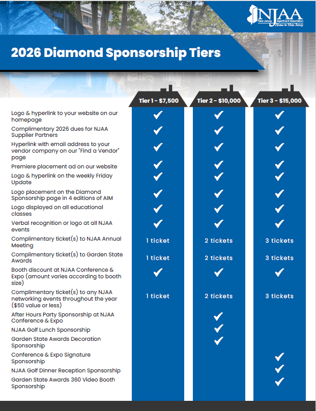 - Complimentary NJAA dues for Supplier Partner members as well as a free listing on the website